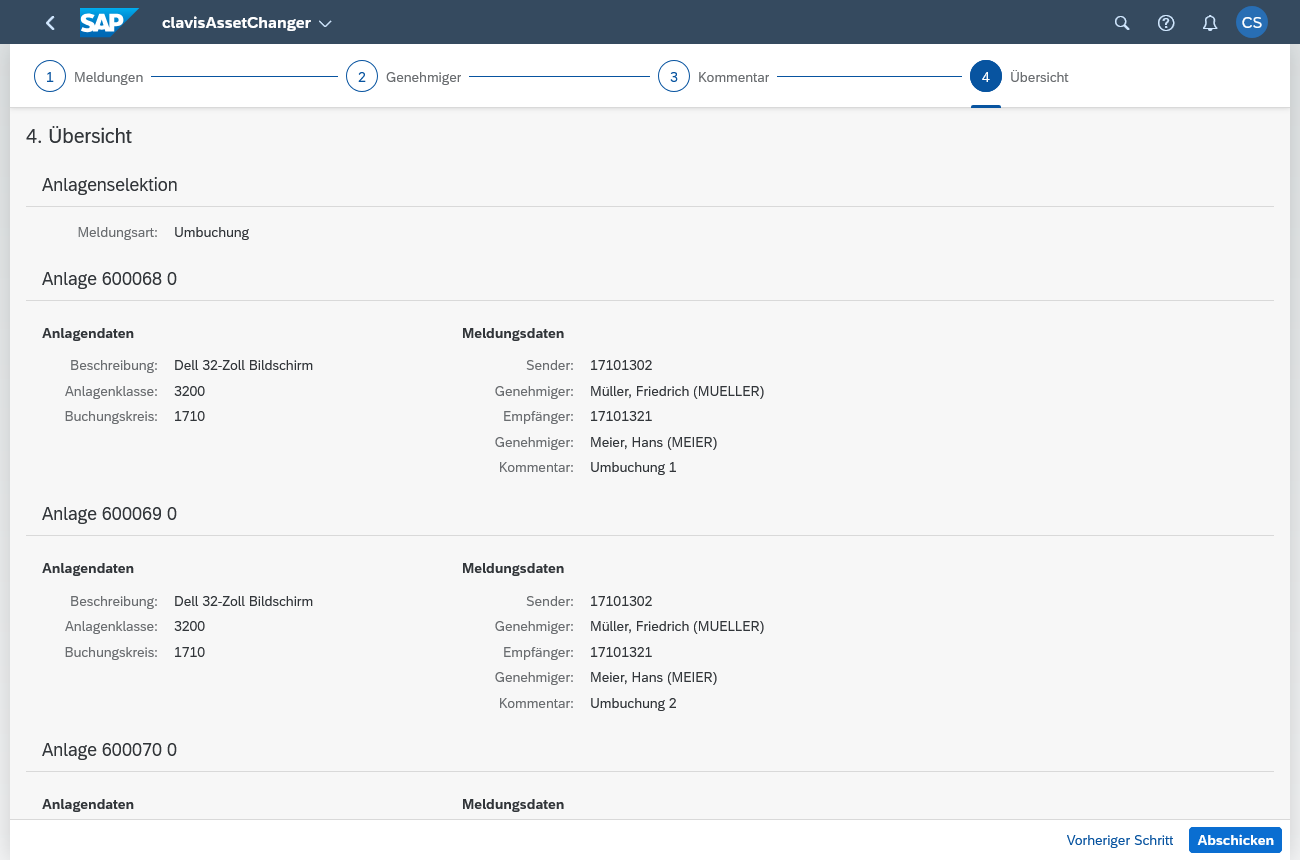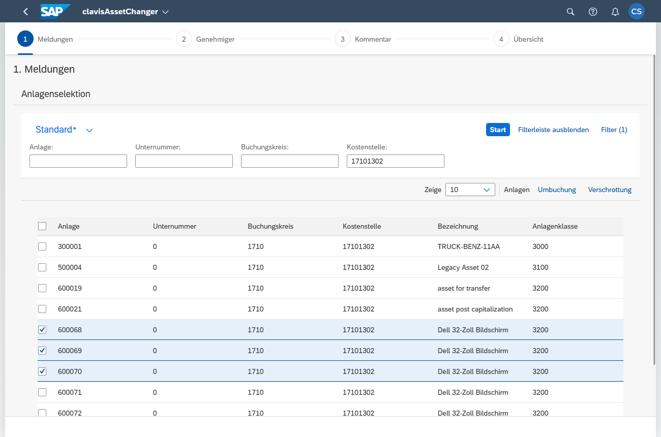 • Volle Flexibilität: Es können Anträge für Umbuchungen (zwischen Kostenstellen, Buchungskreisen, etc.) und Anlagenabgänge (Verschrottung) gestellt werden.